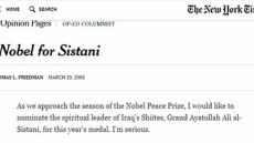 نشر موقع صحيفة (the new York times) بتاريخ 20 / مارس / 2005م، مقالًا بعنوان (نوبل للسيستاني) كتبه: T . . .