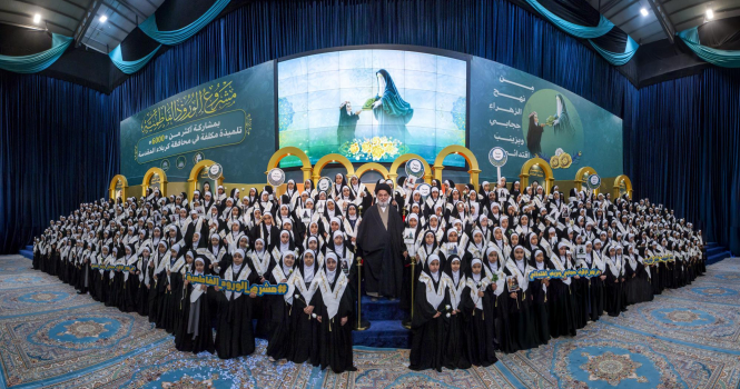 سماحة السيد الصافي يلتقط صورة تذكارية مع التلميذات ضمن حفل التكليف المركزي الثامن
