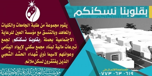 شرع طلبة من الجامعات في العاصمة بغداد بحملة أولى من نوعها في مجال العمل الخيري الإنساني لبناء وحدات سكنية لعدد من عوائل الشهداء المتطوعين اللذين لبوا نداء المرجعية العليا في الدفاع عن الأرض والعرض والمقدسات بالتعاون مع مؤسسة العين .