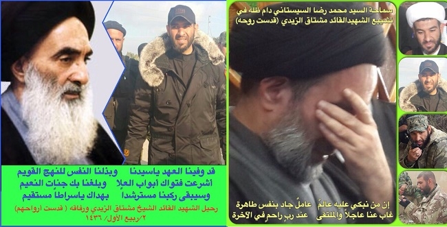 صبيحة اليوم الثاني من ربيع الأول لعام 1436 هجرية – الخميس 25/12/2014 التحق بركب الشهداء، وهم يصعدون حفاة الى السماء حيث دلائل الله، تاركاً وراءه شهيداً أسمه “مشتاق الزيدي” وإرثاً علمي وجهادي يقول فيه” لا إشكال ولا شبهة، أن هذا المشروع الإلهي، الذي بدأ بيد المرجعية ولسانها، هي النيابة الحقيقة للمعصوم في عصر الغيبة، ونحن نقول تبعاً لأمتنا، بأنا على مسيرة الحق سائرون، وسوف لن تنام لنا عين، حتى نطهر أرض العراق، وندافع عن جميع المقدسات)