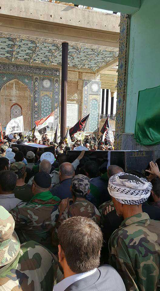 وتابع "وظهر اليوم جرت مراسم تشييع للشهداء في مرقد الإمامين العسكريين ع في سامراء المقدسة وبحضور مدير العتبة سماحة الشيخ ستار المرشدي دام عزه وجمع من فضلاء الحوزة العلمية في النجف الأشرف وشخصيات عسكرية من قواتنا الامنية ".