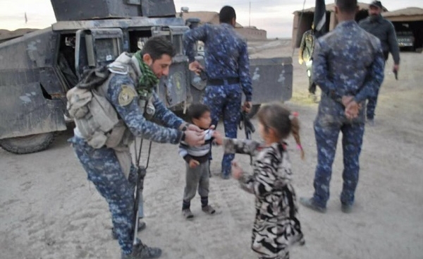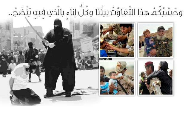 الصورة هي لأحد مقاتلي فتوى الدّفاع المقدّس في إحدى المناطق التي حُرِّرَتْ من محافظة الموصل وهو يحمل طفلةً لاذت به بعد أن أذاقها الدواعش وأعوانهم الهوان طيلة السنتين ونيّف الماضيتين، فوجدته الجدّ الحنون الرؤوم الذي حاولت العصاباتُ الداعشيّة تشويه صورته.. وهذا انموذجٌ لمئات من الحالات الإنسانيّة الأخرى. فكان ذلك بحقٍّ تطبيقاً لقول الشاعر: