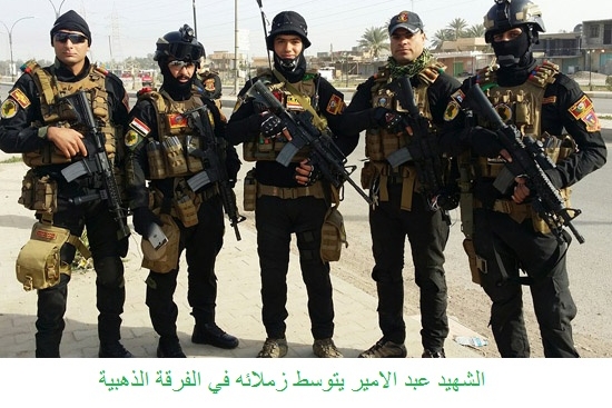 المدن من داعش حتى بات محل إشادة من قبل ضباط الذهبية، موضحاً أنه استشهد أثناء عملية تحرير مدينة برطلة شرق الموصل، حينما انفجر منزل مفخخ على زميله وأصيب بجروح، مادفعه إلى المبادرة لنقله وحمله على كتفه للعودة به، وفي الأثناء هاجمه اثنان من عناصر داعش قتل احدهما فيما أصابه الأخر برصاصة بعنقه أدت إلى استشهاده.