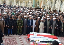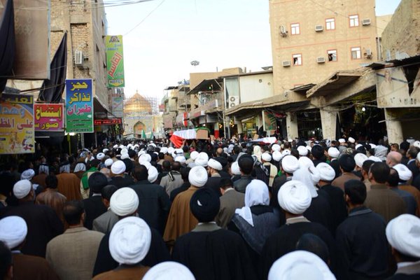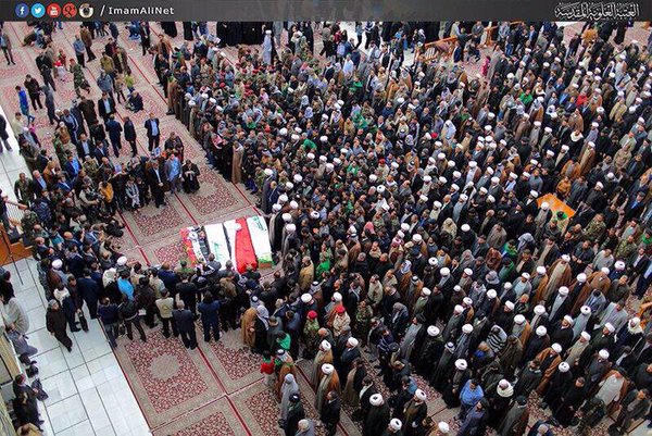 وشيّعت جنازته في تشييع مهيب مع رفاقه الذين استشهدوا معه، حضره الكثير من رجالات الحوزة العلمية كسماحة آية الله السيد محمد رضا السيستاني نجل المرجع الأعلى دام ظله وممثلين عن مكاتب المراجع العظام وطلبته وأحبائه، وصلى عليه استاذه آية الله الشيخ محمد باقر الإيرواني (حفظه الله) في العتبة العلوية المقدسة، ودفن في أرض كان قد اشتراها مسبقا له ولإخوته وعيالهم، وكان قد بنى له قبرا فيها وكتب عليه: