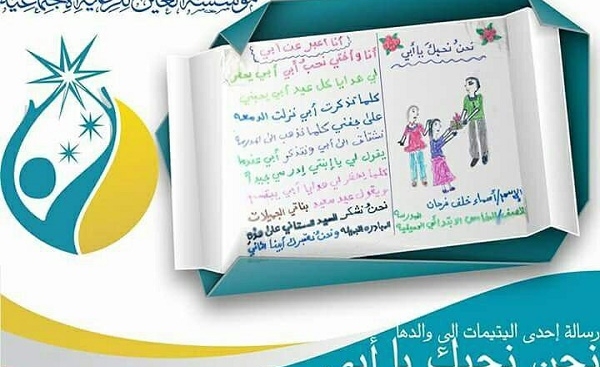 🔸اليتيمة أسماء كتبت "نحن نحبك يا أبي.. أبي يجلب لي الهدايا في كل عيد.. كلما تذكرت أبي نزلت الدمعة على جفني، كلما نذهب إلى المدرسة نتذكر أبي حين كان يقول لنا: ادرسي جيداً ثم يحضر لنا الهدايا مبتسماً ويقول: عيد سعيد بناتي الجميلات.