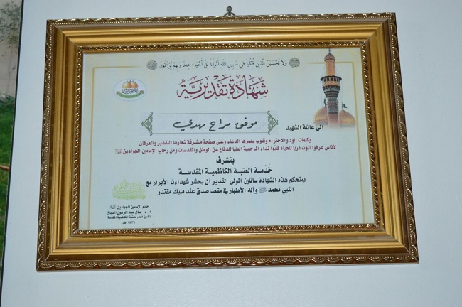 ولكني في نفس الوقت تاسفت وحزنت كثيرا حيث لم ياتي احد لزيارتنا فكنت اقول مع نفسي ان ولدي شهيد وان كان عسكري وبقيت على هذه الحالة يعتصرني الالم . الى ان جئتم اليوم تنقلون سلام السيد السيستاني . فانا ممنون للسيد السيستاني وقد انساني بارسال وفده لي حزني ومصابي على ولدي حيث هذه اول مرة يزورنا وفد ويقدم التعازي شكرا للمرجعية.