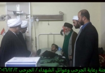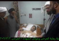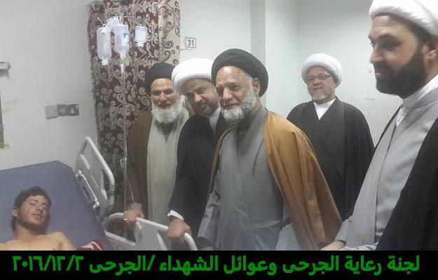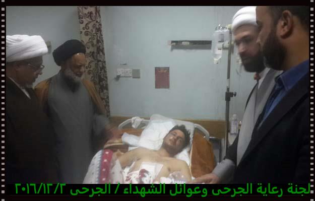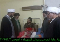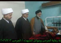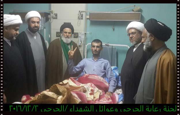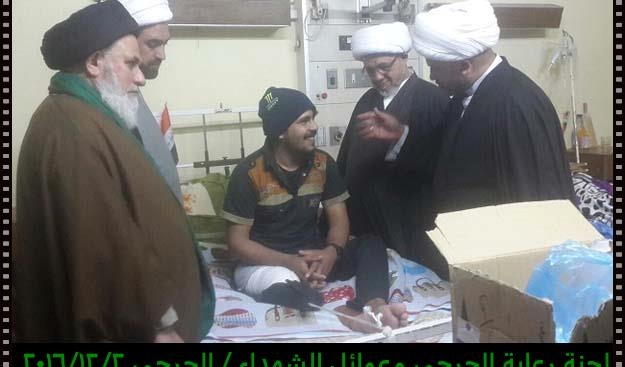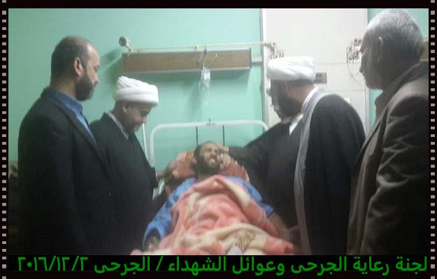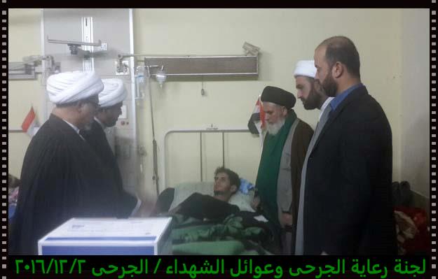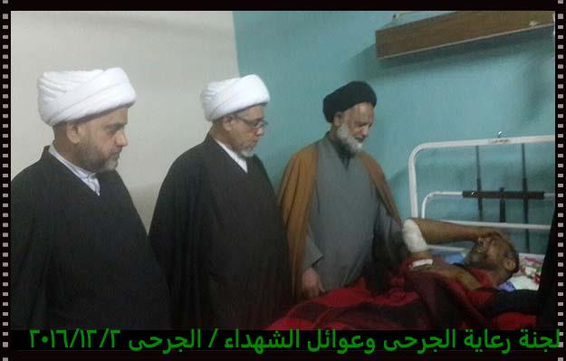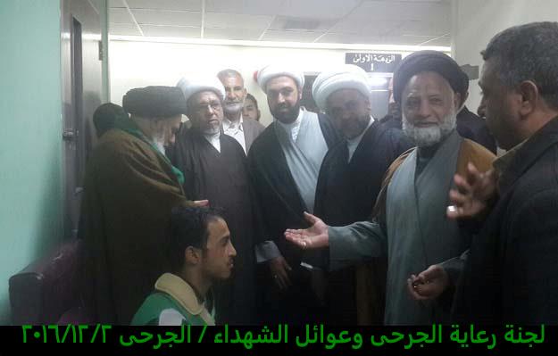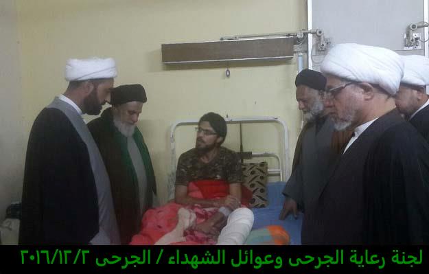 تشرفت لجنة رعاية الجرحى وعوائل الشهداء مساء يوم الجمعة 2/12/2016 بزيارة الجرحى الراقدين في كل من مستشفى الجراحات التخصصية ومستشفى بغداد حيث أبلغناهم سلام ودعاء المرجعية لهم وأن المرجعية تفتخر بهم وتدعوا لهم بالصحة والعافية ، شاهدنا منهم السعادة الكبيرة بهذه الزيارة وسمعنا منهم الكلام الذي يجعلنا ويجعل الجميع يفتخر بهم وبأن البلد فيه هكذا رجال لن يهزم رغم الإصابة وبعضهم اصابتهم ليست بالسهلة لانه بترت احدى ساقيه .
