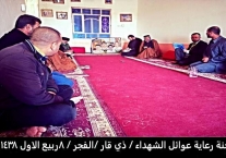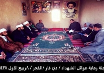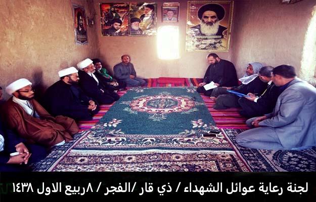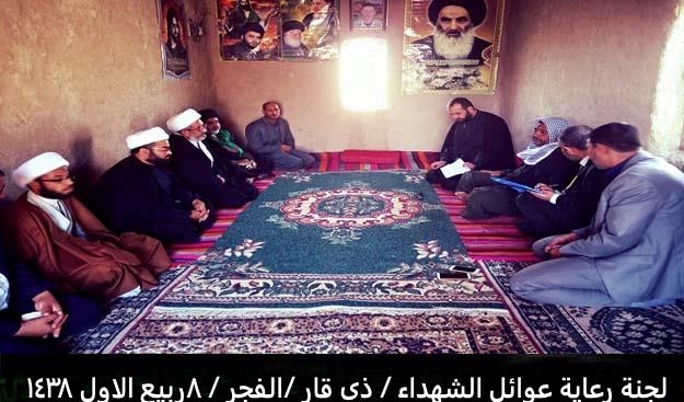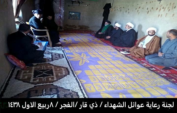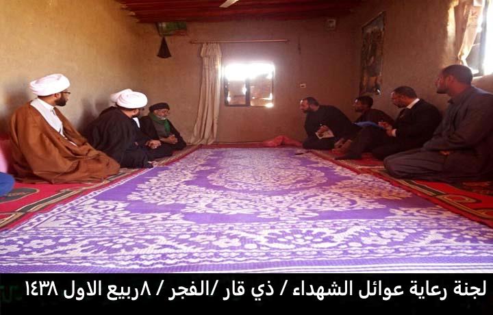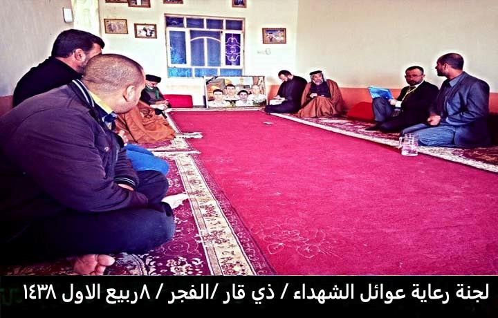 ففي الثامن من ربيع الاول ١٤٣٨ (2016/12/8 ) قامت اللجنة بزيارة عوائل الشهداء من ابطال الجيش والقوى الامنية والمتطوعين في ناحية الفجر التابعة إلى محافظة ذي قار ووجدنا عوائل الشهداء كلهم همة عالية وثبات راسخين ووجدناهم يفتخرون بأن عشيرتهم قد قدمت ٥٤ شهيد وقال وجهاء العشيرة نحن فداء للمرجعية والوطن للذود عن حرمات ومقدسات البلد .