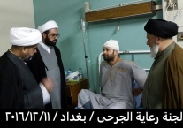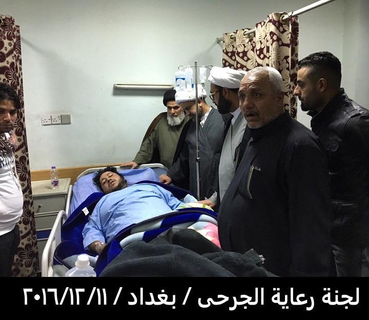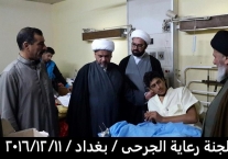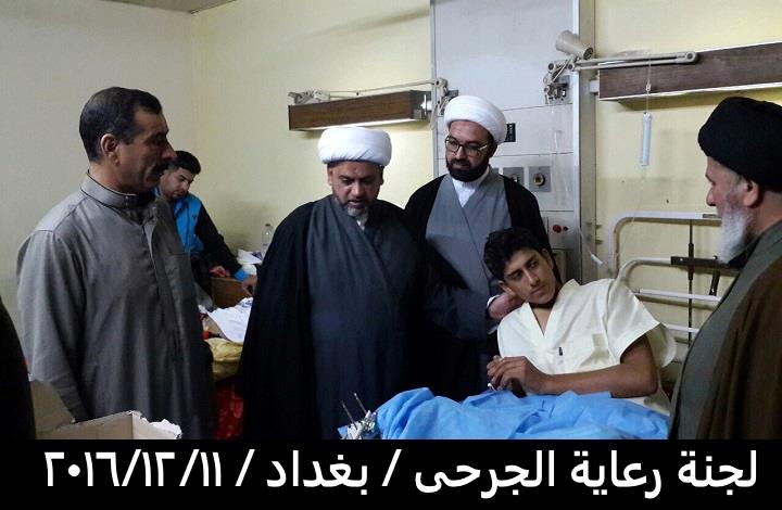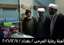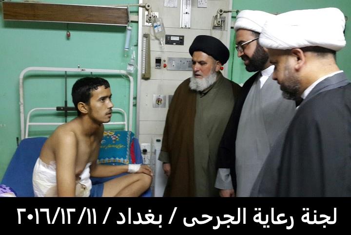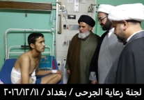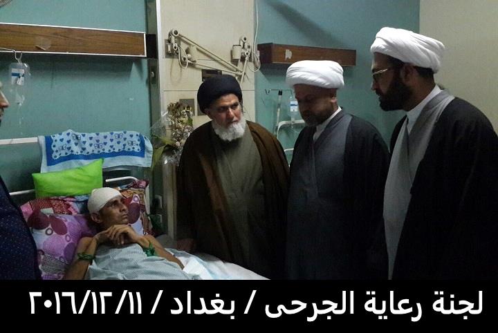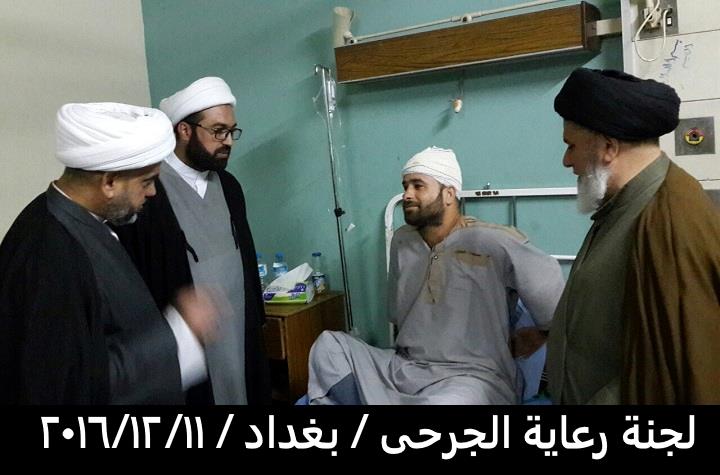 بتوفيق من المولى عز وجل قامت لجنة رعاية الجرحى المكلفة من قبل مكتب سماحة المرجع الاعلى السيد السيستاني دام ظله مساء يوم الأحد المصادف 11/12/2016 بزيارة الجرحى الراقدين في كل من مستشفى الجراحات التخصصية ومستشفى بغداد والذي كان عددهم ٤٥ جريحا من القوات الامنية والمتطوعين والمتطوعين الغيارى وبعد السلام عليهم وتفقدهم والاطمئنان على صحتهم قامت اللجنة بايصال سلام ودعاء المرجعية لهم بالصحة والعافية وان قلبها معهم ورعايتها الأبوية لهم مستمرة لأنهم فخر العراق وكيف لا يكونوا كذلك وهم كل واحد منهم قد ترك ماله وعياله استجابة لفتوى المرجعية العليا بالدفاع عن ارض ووحدة العراق من شر داعش ومن يقف معها وقد سمعنا منهم ان مكانهم ليس بالمستشفى بل في ساحات القتال وعند زيارة احد جرحى من أهالي حديثة من اخوتنا السنة وهو من المتطوعين الغيارى عندما سمع بِنَا نحن وفد المرجعية لهم قال لنا المرجعية أنقذتنا انقذت البونمر والجفايفة في حديثة والبغدادي انتم علم لنا ونحن جسر لكم وممنونين منكم .