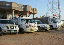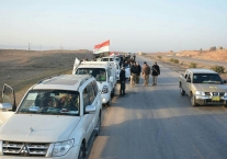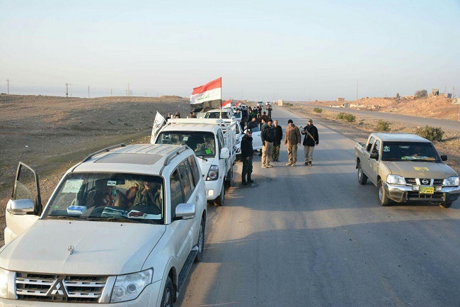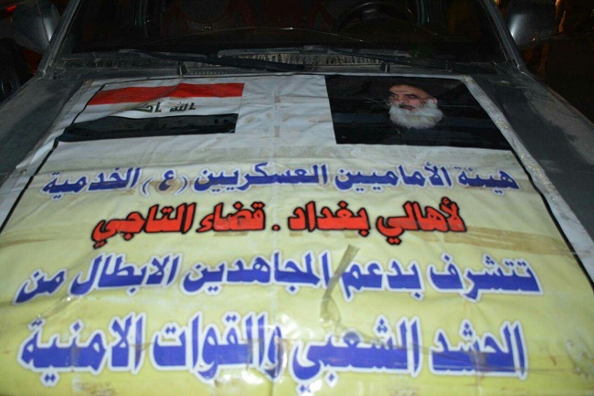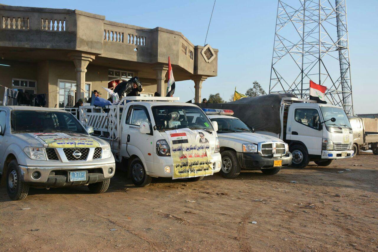 تلبية لنداء المرجعية الدينية العليا في النجف الاشرف سير أهالي قضاء التاجي شمالى بغداد قافلة (هئية الإماميين العسكريين ع ) دعم لوجستي لأبطال قوات الحشد الشعبي ( لواء المنتظر ع ، سرايا الجهاد والبناء ) في مناطق قضاء تلعفر جنوب غرب الموصل .