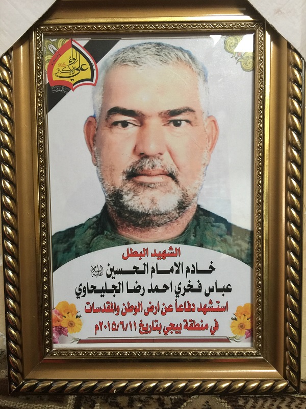 قالت أم علي : منذ ان رأيت هذا الحلم حتى بدأت أطيافه تقض مضجعي الى ان عرفت الاسم المجهول، فكما أخبرتني المرأة سنفقد أربعة شهداء ، والشهيد الأول كان ابن عمتي أما الشهيدان الآخران كانا من جيراننا، والاسم الرابع الذي امتنعت عن ذكره لي كان زوجي ورفيق دربي وأنيس روحي ..عباس ( أبو علي ) الذي عشت معه أجمل ما عشته من سنين عمري، زوجاً صالحاً وأباً حنوناً، شجاعاً لا يهاب الموت فقد أراد أن يذهب الى سوريا ليقاتل هناك، لكنه استثنى عندما اعلنت المرجعية الحكيمة فتوى الجهاد الكفائي ، ليكون في أوائل صفوف الملبين، التحق بركب المجاهدين في جرف الصخر واستمر بالجهاد الى أن حظي بالشرف العظيم والوسام المقدس