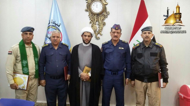 كرمت لجنة الإرشاد والتعبئة للدفاع عن عراق المقدسات التابعة للعتبة العلوية المقدسة مجموعة من قادة وضباط قاعدة الشهيد محمد علاء الجوية ، التابعة لقيادة القوة الجوية ؛ وذلك لعملهم المتواصل في الليل والنهار لدحر الإرهاب، وتقديم الإسناد لكافة القطعات العسكرية المشاركة بمحاربة داعش الإرهابي ، ومساعدة الاسرة النازحة وإنقاذهم من بطش الإرهابيين ، وذلك بتسليمهم كتب شكر وأوشحة من مرقد أمير المؤمنين علي بن أبي طالب عليه السلام.