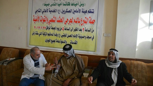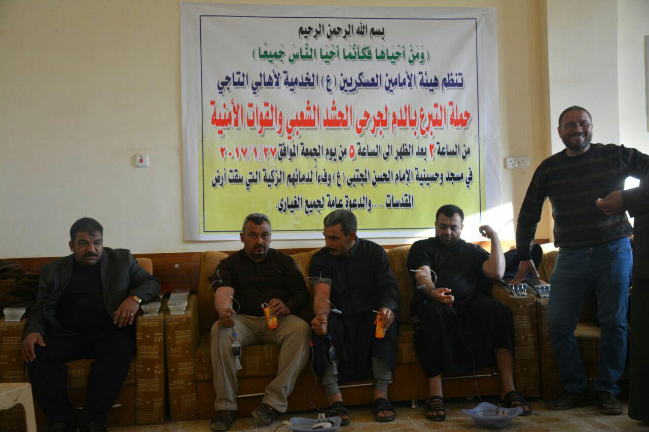 يوم الجمعة الموافق 27/ 01/ 2017 وبتنسيق وتنظيم عالي المستوى من ابناء هيئة الامامين العسكريين (عليهما السلام) حملة التبرع بالدم لجرحى الحشد الشعبي والقوات الامنية التي جرت في مسجد وحسينية الامام الحسن المجتبى ع في منطقة (ابوعظام -الشهداء) .