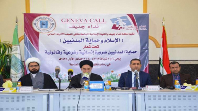 بهدف كشف جرائم مجاميع داعش الارهابية في العراق وفضح مخططاتهم امام الرأي العام العالمي والدولي فضلا عن ابراز الصورة الناصعة للقوات الامنية والحشد الشعبي وتعاملهم الانساني خلال عمليات تحرير المناطق التي احتلت من قبل داعش شاركت العتبة الحسينية المقدسة في مؤتمر نداء جنيف الذي اقيم في الجامعة الاسلامية في مدينة النجف الاشرف للفترة (6-7/ شباط /2017)، وتحت عنوان “حماية المدنيين ضرورة إنسانية وقانونية وشرعية”.