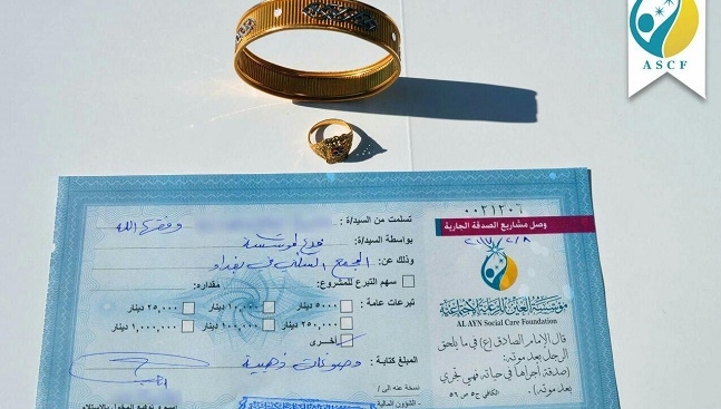 السيدة البصرية جادت بمصوغات بحلي زواجها وخصصته لمشروع الصدقة_الجارية الذي تنشؤه المؤسسة في العاصمة بغداد بعنوان "مجمع الإمام الجواد السكني" موقنةً بأن ما جادت به ستلاقي أجره المستمر في الدنيا و الآخرة .
