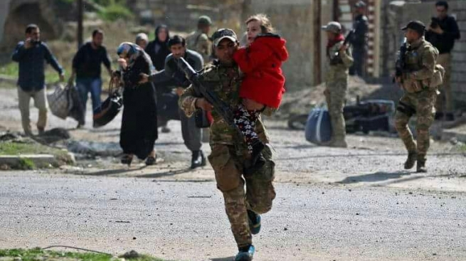 7_ بالصورة بطل من قوات الرد السريع يساعد طفلا نازحاً من حي الطيران في الجانب الأيمن الموصل .