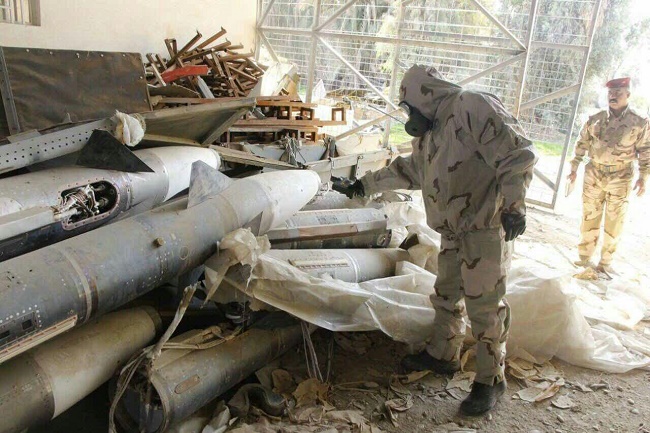 ضمن فعاليات لواء المشاة 75 / فرقة المشاة السادسة عشرة في الجانب الأيسر من مدينة الموصل، وخلال عمليات التطهير في حي النركال، عثر أبطال اللواء أعلاه صباح يوم الثلاثاء الموافق 7 آذار2017، على مخازن تحتوي مواد كيمياوية وعدداً من الصواريخ، ولغرض السيطرة على المواد أعلاه ومعرفة ماهيتها، حضرت لجنة من مديرية الصنف الكيماوي، وبعد الفحص تبين أن المواد هي عبارة عن كلوريسين يُقدر بـ (١٠) آلاف لتر موضوعة داخل خزان؛ وهي مادة حارقة وشديدة الاشتعال تدخل في صناعة المواد المتفجرة و(٢٩) صاروخ سام /٧ أرض جو من دون موجهات، ومادة الفوسفات الخام بكميات كبيرة وعدد من المقذوفات مختلفة الأنواع، حيث قامت القوة بإحاطة المواد أعلاه ونقلها إلى أماكن آمنة حفاظاً على أرواح المواطنين.