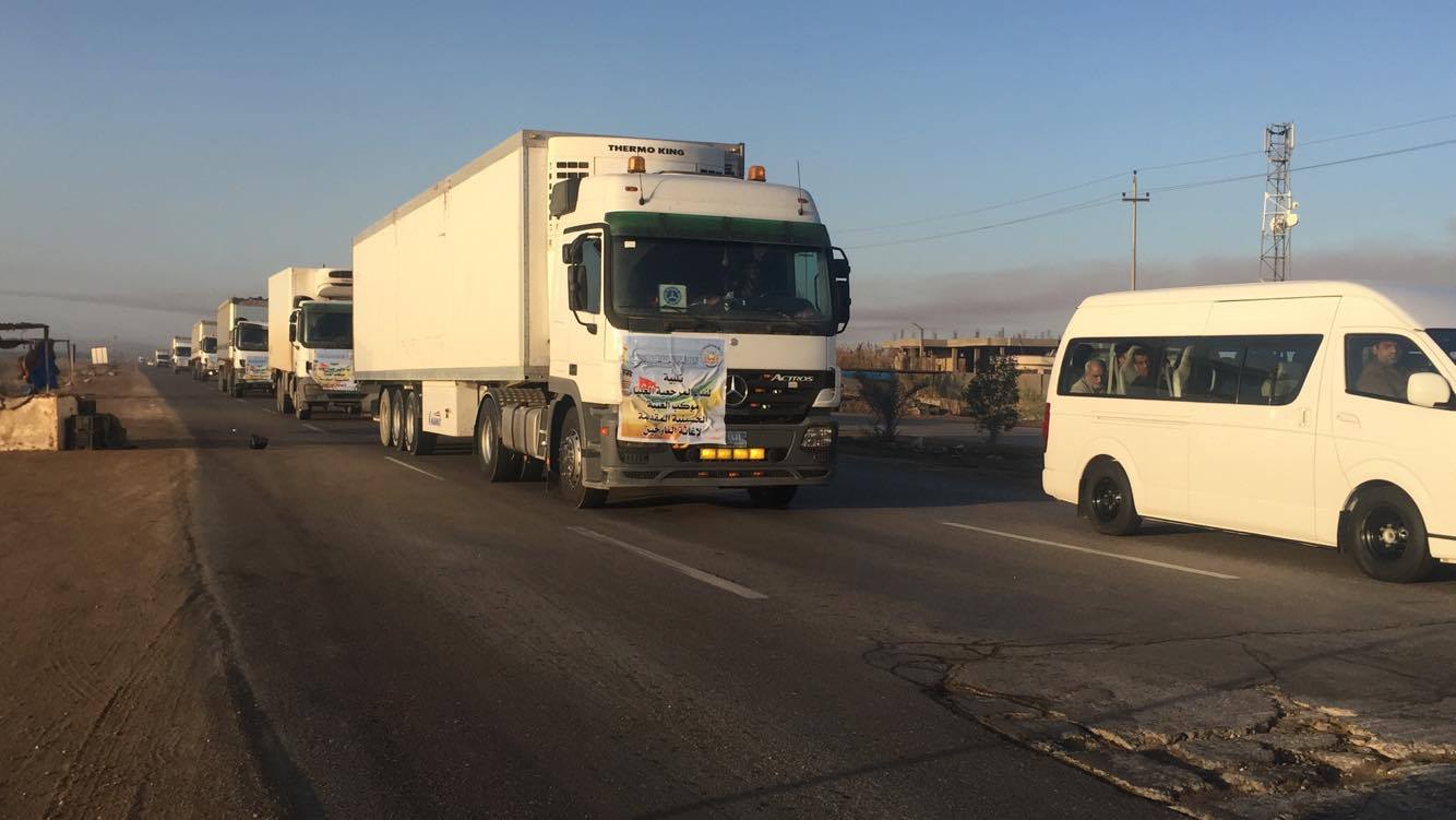 امتثالا لأمر المرجعية الدينية العليا في النجف الاشرف انطلقت صباح اليوم الجمعة اكبر قافلة مساعدات انسانية من كربلاء الى الموصل لدعم نازحيها هناك .