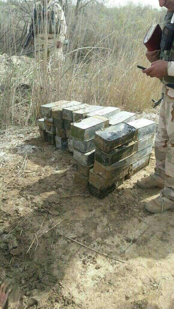 تمكنت قواتنا الامنية في اللواء (22) قاطع عمليات شمال بغداد من العثور عل كدس يحتوي عل (40) حاوية عتاد مختلفه مخبأة تحت الارض في بساتين البوحوسه شمالي بغداد .