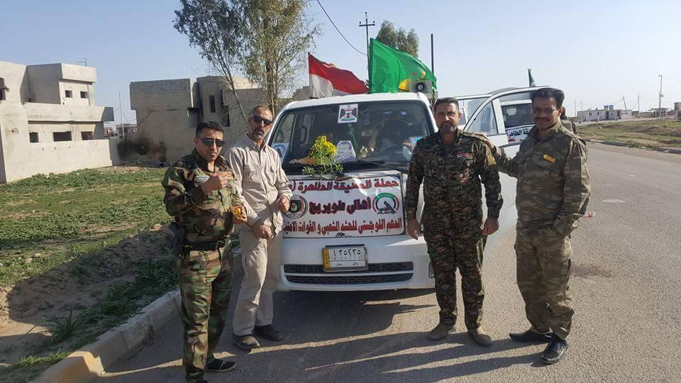 تنفيذا لامر المرجعية الدينية العليا في ادامة زخم المعركة انطلقت حملة الصديقة الطاهرة ( عليها السلام ) اهالي طويريج لدعم واسناد الحشد الشعبي المقدس والقوات الامنية يومي الجمعة والسبت 7و8 نيسان 2017 الى سواتر العز والشرف في الموصل الجانب الايسر في تل عبطة الجنوبي وتل عبطة وعين الحصان حيث ضم الموكب 37 سيارة محملة بكل ما يحتاجه المقاتل من مواد غذائية وماء وعصائر وفواكه وغيرها لقوات سرايا الخرساني وكتائب سيد الشهداء وكتائب الامام علي ( عليه السلام ) وكانت رسائل المجاهدين للمواكب التي تصلهم ( بان مجيء المواكب الحسينية والحملات لنا هو يزيدنا عزما في الثبات والبقاء واما النصر والشهادة ونحن في مأمن هنا في الساترعلى اطفالنا وعوائلنا مادام هنالك اناس ضحوا بالمجيء والوصول الينا بالرغم من كل الظروف والصعاب من الحر والبرد والمطر وعلى مدار قرابة ثلاثة سنوات من الفتوى المباركة ويسالون عنا وعن عوائلنا في غيابنا وعن احتياجهم )