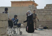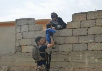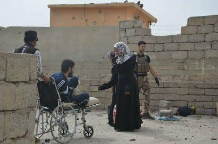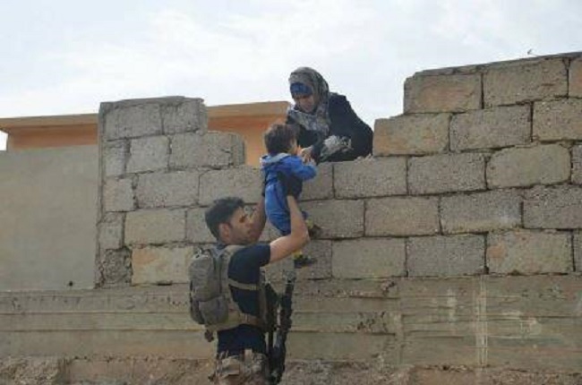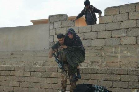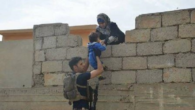 في لقطات تندر مثيلاتها يظهر ابطال القوات الامنية وهم يساعدون النازحين من مناطق الاشتباك