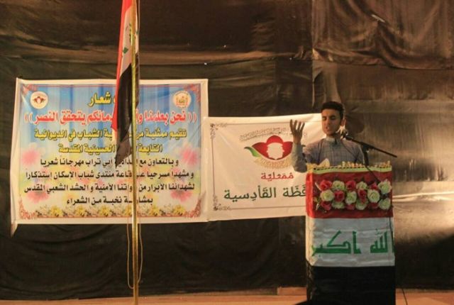 تحت شعار (نحن بعملنا وانتم بدمائكم يتحقق النصر) اقامت ممثلية مركز رعاية الشباب في الديوانية التابع لقسم النشاطات العامة في العتبة الحسينية المقدسة وبالتعاون مع اعدادية ابي تراب مهرجاناً شعرياً وعرضاً مسرحياً، بالتزامن مع افراح شهر شعبان المعظم واستذكارا لشهداء العراق من القوات الامنية والحشد الشعبي، على قاعة منتدى شباب الاسكان في الديوانية وبمشاركة نخبة من الشعراء الشباب والفنانين.