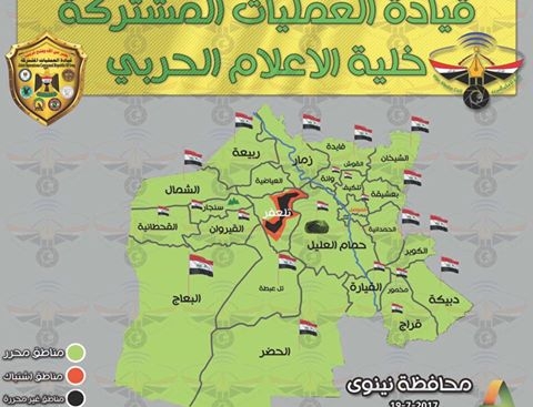 نشرت خلية الاعلام الحربي خريطة جديدة لمناطق محافظة نينوى المحرره ، واوضحت الخريطة ان قضاء تلعفر اخر ما تبقى من المحافظة تحت سيطرة عصابات داعش الارهابي.