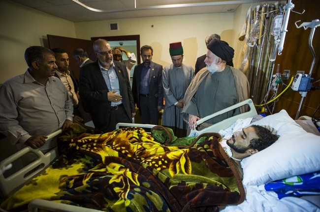 الوفد الذي ترأسه السيد عدنان الموسوي من قسم الشؤون الدينية في العتبة العباسية المقدسة، اطلع على الأوضاع الصحية للجرحى، وتابع الخدمات الصحية المقدمة، مشيدا بالوقت ذاته بشجاعتهم وصمودهم وبدمائهم الزكية التي روت ساحات المنازلة والشرف والتي بها حفظ العراق ومقدساته، وصينت كرامته، واستعاد حريته التي حاولت خفافيش الظلام من العصابات الإرهابية سلبها منه.. فبالقتال والجهاد حفظتم وحدة العراق.. داعيا كذلك لهم بالشفاء التام، وأن يمنّ الله عليهم بالصحة، كما نقل الوفد سلام وتحيات خدمة ابي الفضل العباس (عليه السلام) ودعائه لهم، وقدم هدايا مادّية لهم من حرم أبي الفضل العبّاس (عليه السلام) وأخرى تبرّكية.