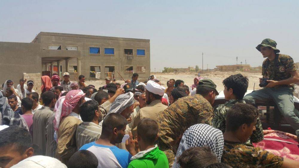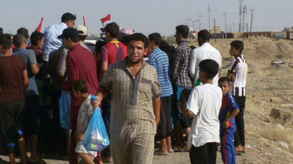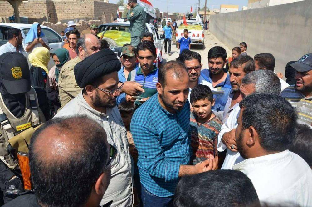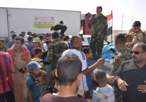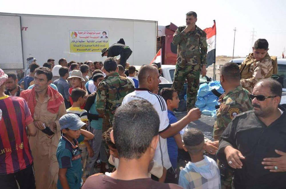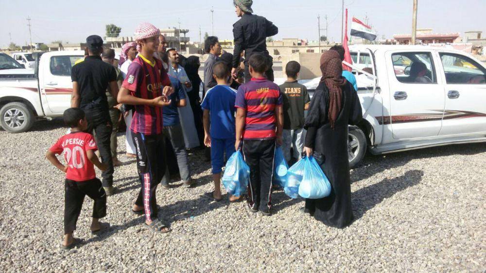 وأشار البيان: "فرق الإغاثة لاحظت الحالة المزرية للعوائل بسبب ما تعانيه من الجوع والعطش، وبالخصوص الرضّع، حيث قامت فرق الإغاثة بتجهيزهم بحليب الأطفال مع قناني الرضاعة، ووزّعت سلّات غذائية تحوي علب العصائر والحلويات، وقدّمت مياه الشرب المعقّمة مع الثلج، حيث تمّ إلحاق ذلك بـ(2,000) قالب ثلج تمّ توزيعها على كلّ المناطق التي يتواجد فيها النازحون، كما قامت فرق الإغاثة بتوزيع ملابس وأحذية وبطانيات لتلك العوائل". مؤكّداً أنّ: "تلك الخطوة رسمت الابتسامة من جديد على الشفاه الذابلة للشيوخ والأطفال والنساء الذين أرهبهم إجرام عصابات داعش التكفيرية".
