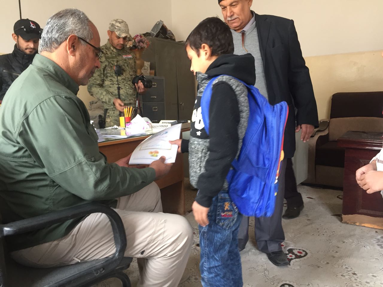لواء علي الاكبر يقوم بتوزيع الكتب والمستلزمات المدرسية على الطلبة في بيجي