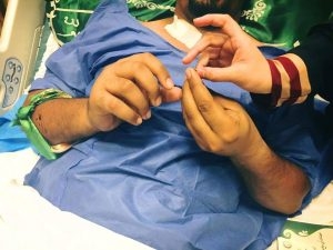 الصورة الثالثة والأخيرة، إذ لا يمكن استعراض جميع الصور وهي كثيرة لشبابنا المجاهدين، لذا نكتفي بهذه الصورة التي تعكس بطولة وشهامة وتضحية ووفاء وإخلاص المرأة العراقية من أجل الوطن، إذ شاهدنا تمسك خطيبة أمجد به بعد قطع ساقيه، ولابدّ من تسليط الضوء على هذه الحالة لأنها تستحق الاهتمام.