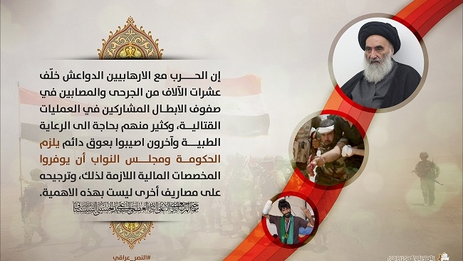 ـ " .. شعبنا كثير النزف .. توَّج عطاءه بالفتنة الداعشية إلى أن أقبرها وأنهاها .. هذه الفتنة لا تنتهي ولا تُقبر إلا بهذا الدّم ..".