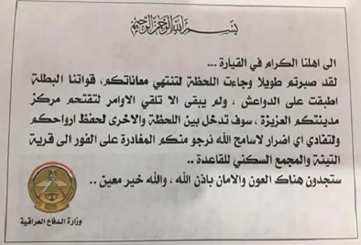 وزارة الدفاع تدعو اهالي القيارة جنوب الموصل الى مغادرتها فورا الى قرية التينة والمجمع السكني للقاعدة .