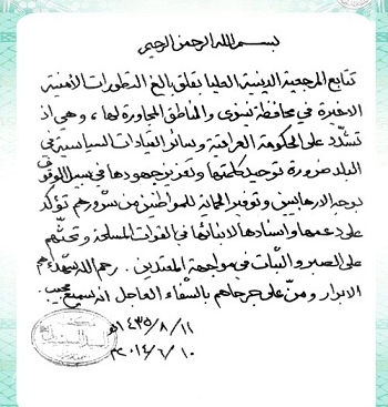 اعلن فيها وجوب حمل السلاح للقادرين عليه والتصدي للدفاع عن البلد واهله وسلامة مواطنية ومقدساته، واكد ان هذا الدفاع واجب على الجميع بالوجوب الكفائي ..