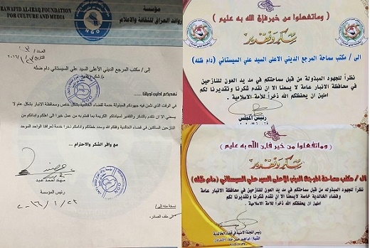 حصلت لجنة اغاثة النازحين في مكتب السید السيستاني كتب شكر من عدة جهات حكومية ومنظمات مجتمع مدني وذلك لتقديم عرفانها الجميل الى سماحة السيد السيستاني لتقديمه المساعدات العينية والمالية .