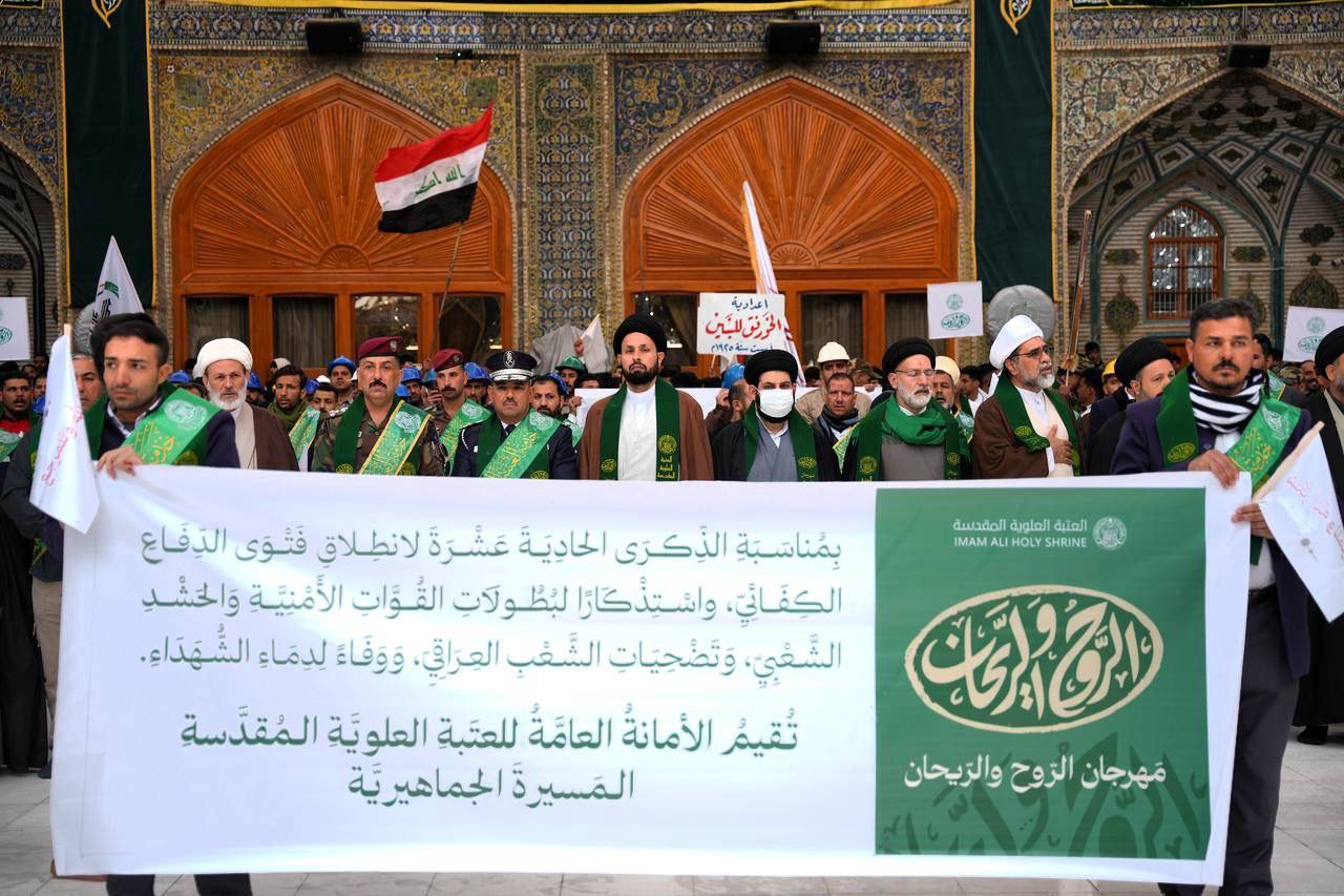 فرقة العباس القتالية تشارك في المسيرة الجماهيرية التي أقامتها الأمانة العامة للعتبة العلوية المقدسة في النجف الاشرف، بمناسبة الذكرى الحادية عشرة لانطلاق فتوى الدفاع الكفائي، واستذكاراً لبطولات القوات الأمنية والحشد الشعبي، وتضحيات الشعب العراقي، ووفاءً لدماء الشهداء، وذلك في إطار مهرجان الروح والريحان السنوي للعتبة.