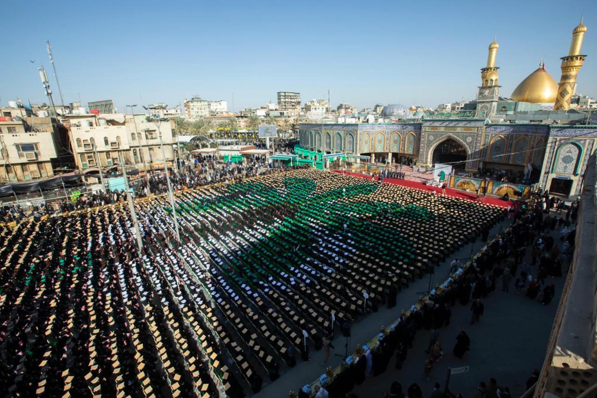 وجسَّدت طريقةُ الجلوس عند باب قبلة مرقد أبي الفضل العباس (عليه السلام)، رسمة النخلة العراقية عبر تنظيم وترتيب مقاعد جلوس الطالبات وألوان قبعات التخرج الخاصة بهنَّ.