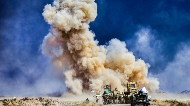 يظهر المجاهدون وهم يسيرون على طريق غير ممهد، محاطين بآليات عسكرية، ويرفعون راياتهم.