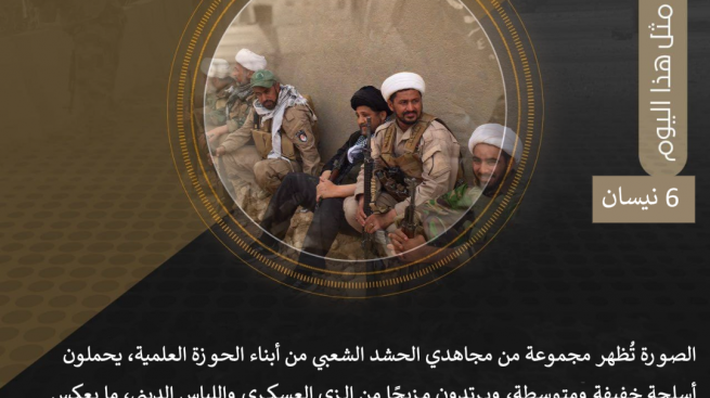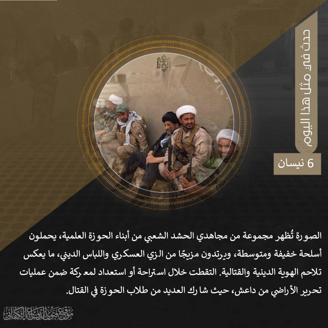 في مثل هذا اليوم، توثق عدسة الصورة لحظة من لحظات العزّة والفداء، يظهر فيها جمعٌ من مجاهدي الحشد الشعبي من أبناء الحوزة العلمية، خلال مشاركتهم في معارك تحرير الأراضي العراقية من قبضة داعش الإرهابي.