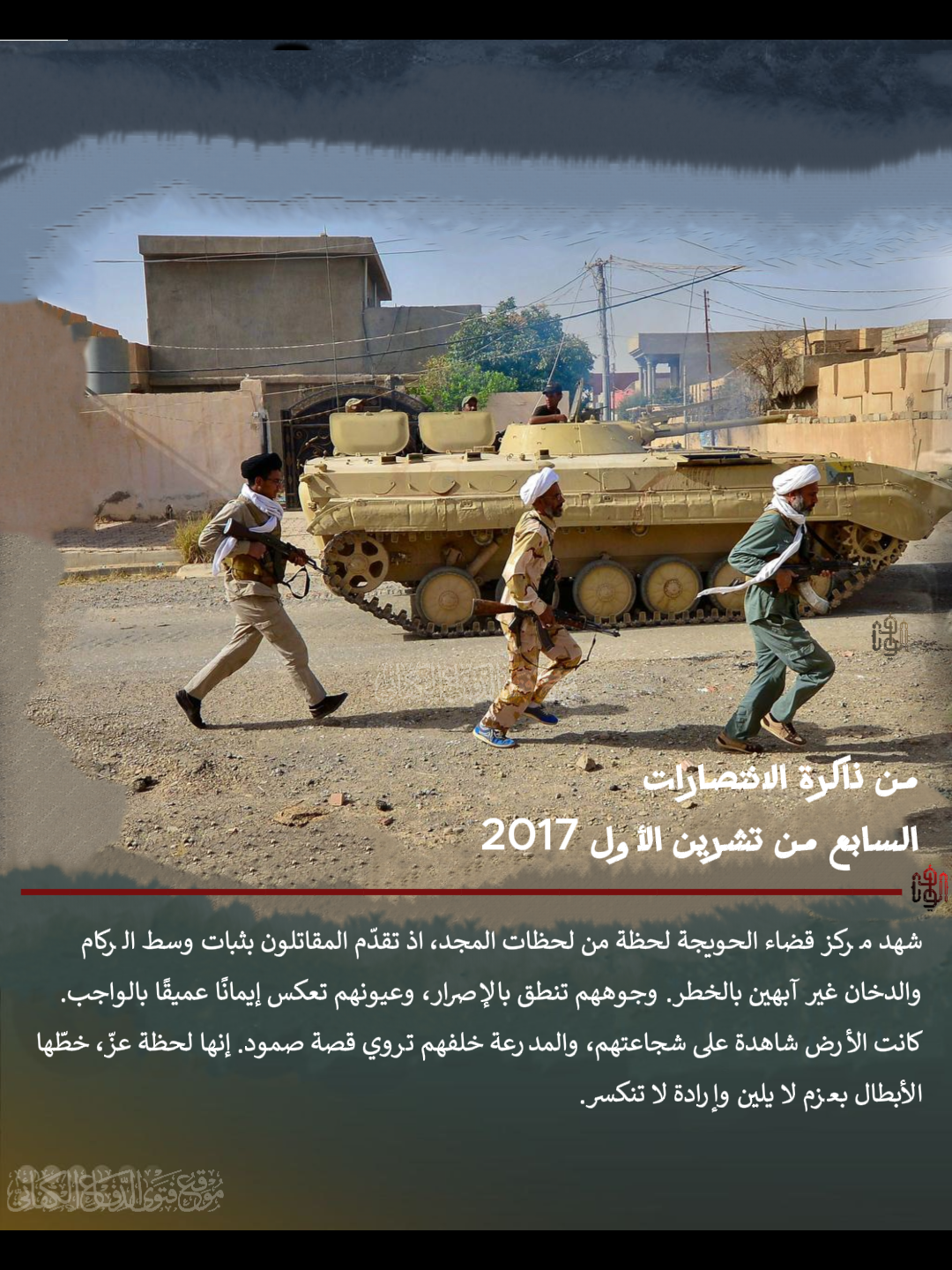من ذاكرة الانتصارات التي خطّها الأبطال بمداد التضحية والكرامة، تنبض اللحظة بالعزم والثبات. هناك، في قلب مركز قضاء الحويجة، في السابع من تشرين الأول عام 2017، كان المقاتلون يتقدمون بخطى واثقة، يشقّون طريقهم وسط الركام والدخان، غير عابئين بالمخاطر التي تحيط بهم من كل صوب.