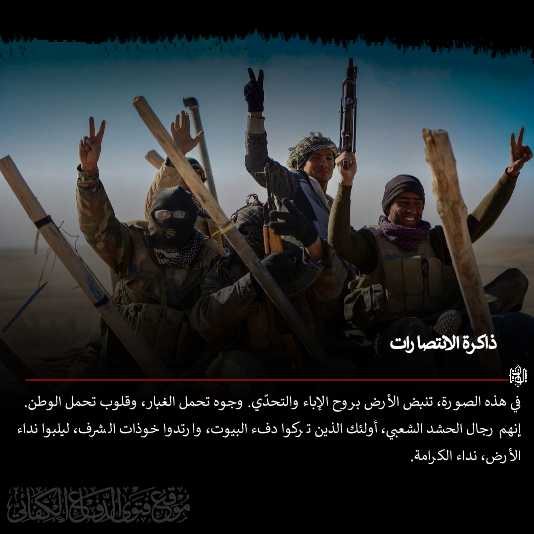 في صورة تختصر مشهد البطولة والفداء، يظهر أبطال الفتوى الدفاعية – رجال الحشد الشعبي – وقد اعتلت وجوههم ملامح الغبار، لكن قلوبهم بقيت مفعمة بحب الوطن وروح التحدي. إنها صورة من ذاكرة الانتصارات التي سطرها العراقيون في مواجهة الإرهاب، حينما لَبّى هؤلاء الرجال نداء المرجعية العليا، وتركوا دفء البيوت خلفهم، ليرتدوا خوذات الشرف ويصطفّوا في خنادق العز.