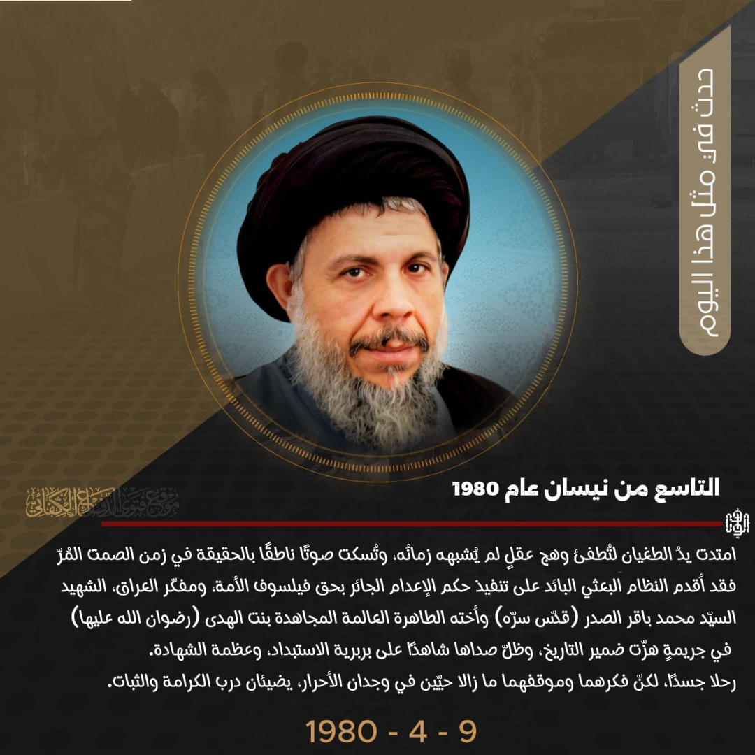 في مثل هذا اليوم، التاسع من نيسان عام 1980، امتدت يدُ الطغيان لتُطفئ وهج عقلٍ لم يُشبهه زمانُه، وتُسكت صوتًا ناطقًا بالحقيقة في زمن الصمت المُرّ. فقد أقدم النظام البعثي البائد على تنفيذ حكم الإعدام الجائر بحق فيلسوف الأمة، ومفكّر العراق، الشهيد السيّد محمد باقر الصدر (قدّس سرّه)، وأخته الطاهرة العالمة المجاهدة بنت الهدى (رضوان الله عليها)، في جريمةٍ هزّت ضمير التاريخ، وظلّ صداها شاهدًا على بربرية الاستبداد، وعظمة الشهادة.