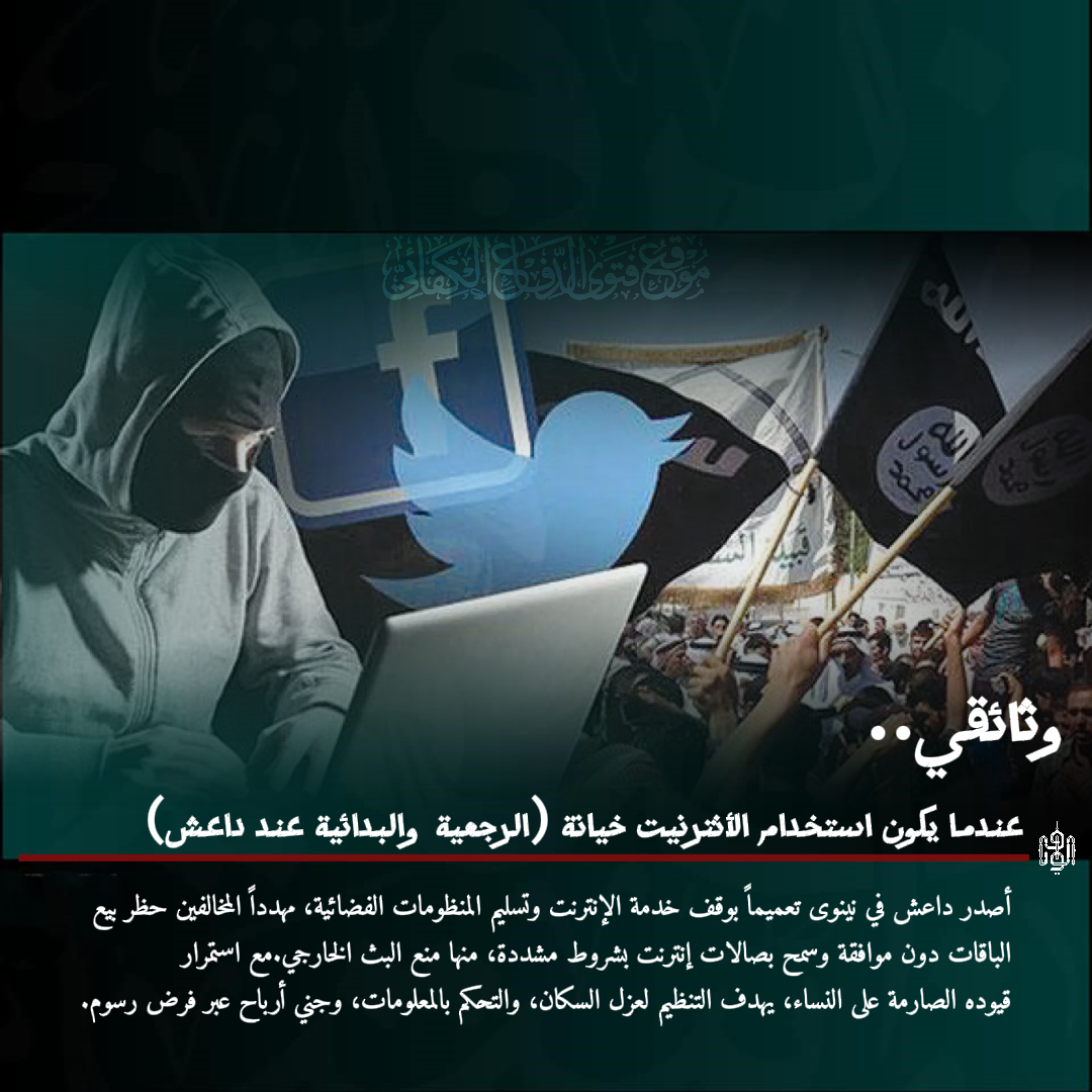 أصدر ديوان الأمن العام التابع لتنظيم داعش الإرهابي في محافظة نينوى؛ شمالي العراق، تعميماً إلى جميع شركات الانترنت والمشتركين؛ بضرورة وقف خدمة الانترنت بدء من تاريخه والزم التعميم كل من يمتلك منظومات فضائية فعالة او غير فعالة (منزلية، تجارية، صالات انترنيت) تسليمها بكامل قطعها للتنظيم؛ وإلا سيعرض نفسه "للمساءلة الأمنية".