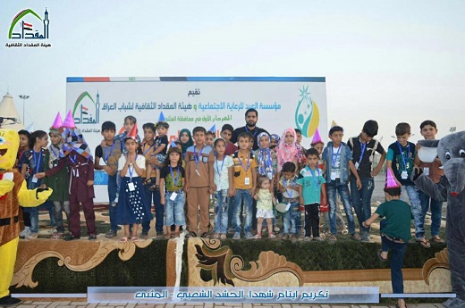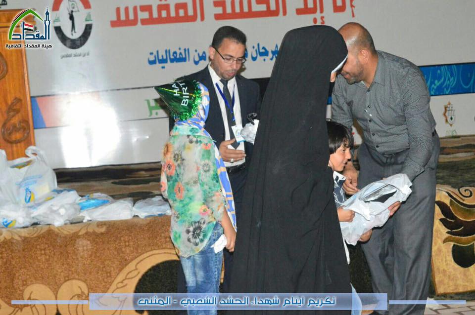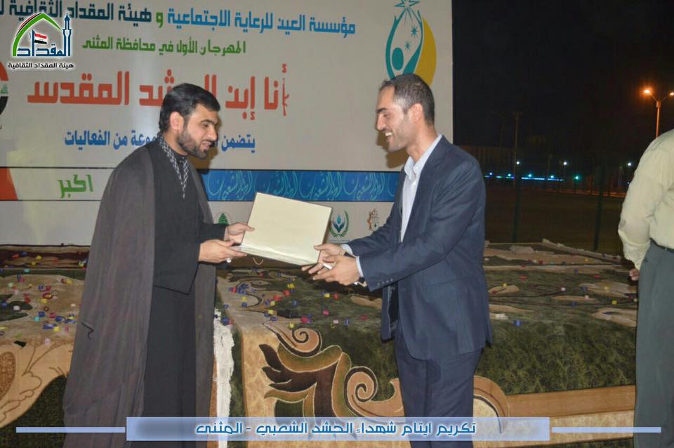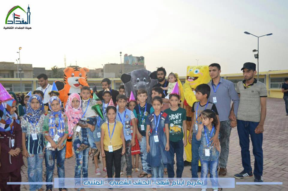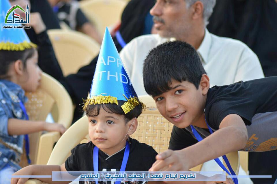 استجابة لتوجيهات المرجع الاعلى السيد السيستاني (دام ظله العالي) في الاهتمام بعوائل الشهداء وايتامهم اقام شباب هيئة المقداد الثقافية وبالتعاون مع مؤسسة العين للرعاية الاجتماعية في محافظة المثنى حفل تكريم ايتام شهداء الحشد المقدس في مدينة السماوة ، شارك في الحفل ممثلية المرجعية الدينية العليا وبعض الوجهاء والتدريسيين في المحافظة ، افتتح الحفل بقراءة مباركة لآي من القرآن الحكيم وبعدها تم الاستماع الى النشيد الوطني ثم قراءة سورة الفاتحة على ارواح الشهداء السعداء واعقب ذلك مشاركة شعرية جسد فيها الشعراء بطولات الحشد الشعبي المقدس، وكانت هنالك كلمة للامانة العامة لهيئة المقداد الثقافية حيث عبر فيها الامين العام عن شكره وامتنانه للاخوة القائمين على الحفل لاهتمامهم بالايتام الذين فقدوا اعز ما يملكون من اجل الوطن و الدين ، واضاف ان مكانة الشهداء ان شاء الله مع انصار الامام الحسين (عليه السلام) وختم كلمته بما قاله المرجع الاعلى في حق المجاهدين (يا ليتنا كنا معكم فنفوز فوزاً عظيماً).