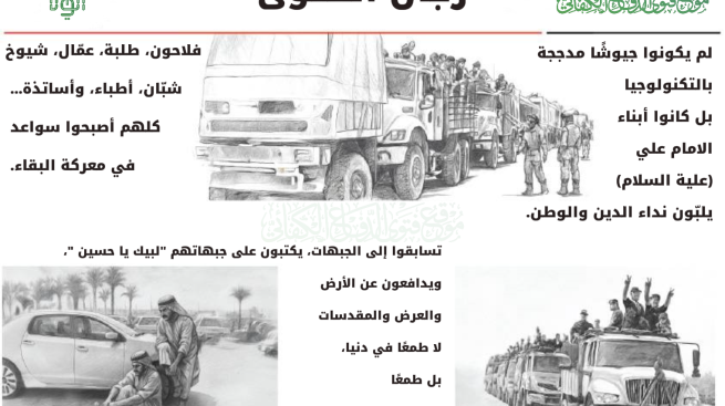 لم يكونوا جيوشًا مدججة بالتكنولوجيا، بل كانوا أبناء الامام علي بن ابي طالب (علية السلام)، يلبّون نداء الدين والوطن. فلاحون، طلبة، عمّال، شيوخ، شبّان، أطباء، وأساتذة... كلهم أصبحوا سواعد في معركة البقاء. تسابقوا إلى الجبهات، يكتبون على جبهاتهم "لبيك يا حسين"، ويدافعون عن الأرض والعرض والمقدسات، لا طمعًا في دنيا، بل طمعًا في رضا الله وحفظ العراق.