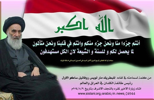 أنتم جزءٌ منا ونحن جزءٌ منكم وانتم في قلبنا ونحن متألمون لما يحصل لكم وللسنة والشيعة لان الكل مستهدفون هذا كلام المرجع الديني الأعلى آية الله السيد على الحسيني السيستاني للبطريرك مار لويس روفائيل ساكو الاول رئيس طائفة الكلدان في العراق والعالم اثناء زيارة الاخير لمقره بالنجف الاشرف