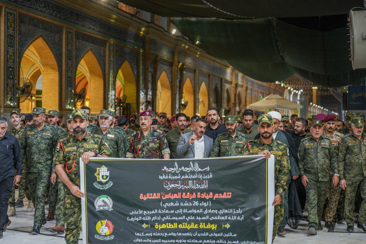 قدّم وفد رفيع من فرقة العباس القتالية، ترأسه قائد الفرقة سماحة الشيخ ميثم الزيدي، خالص التعازي والمواساة إلى أسرة المرجع الديني الأعلى سماحة آية الله العظمى السيد علي الحسيني السيستاني (دام ظله الوارف)، وذلك بوفاة عقيلته.