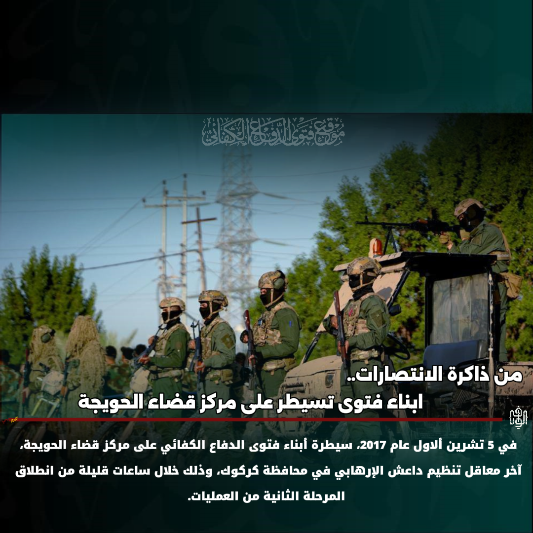 في مثل هذا اليوم من عام 2017، سجّل أبناء فتوى الدفاع الكفائي ومعهم القوات الأمنية العراقية نصراً تاريخياً بعد سيطرتهم على مركز قضاء الحويجة في محافظة كركوك، الذي كان يُعدّ آخر معاقل داعش الإرهابي في المنطقة.