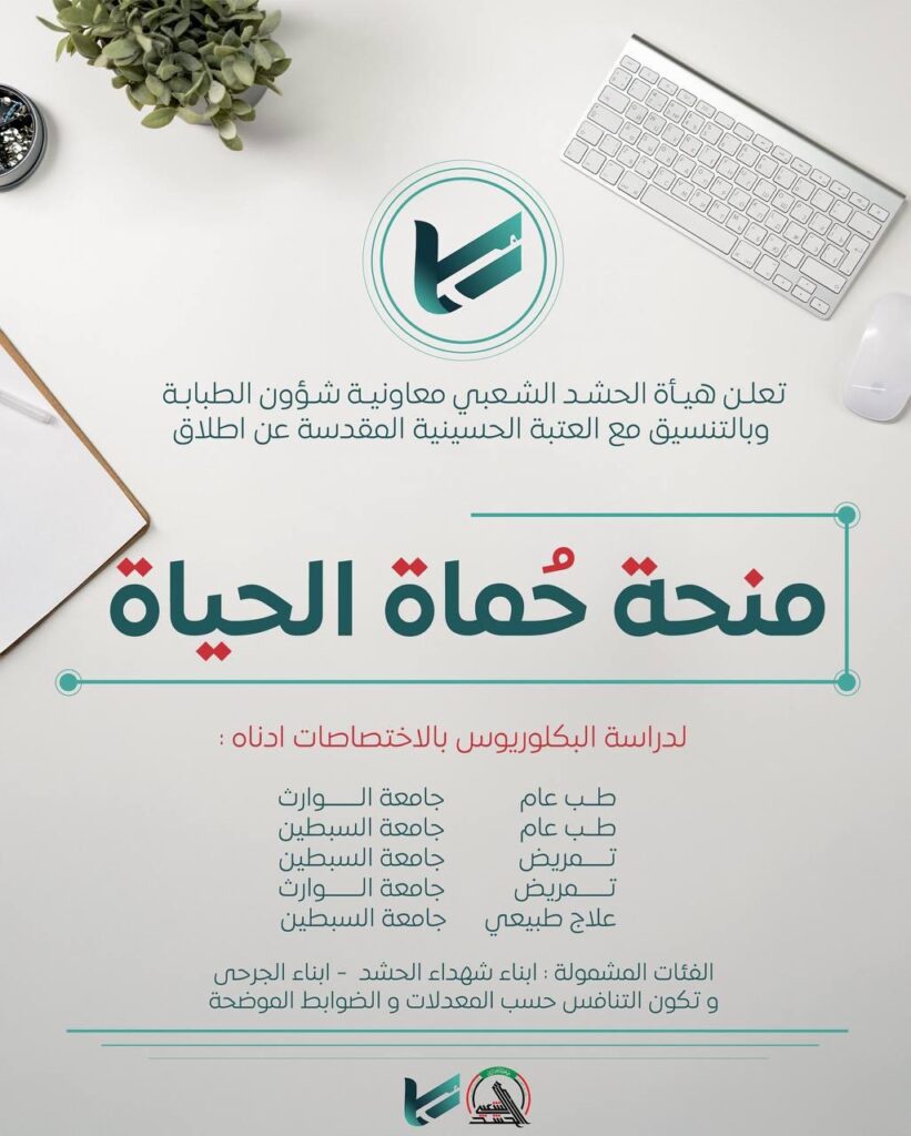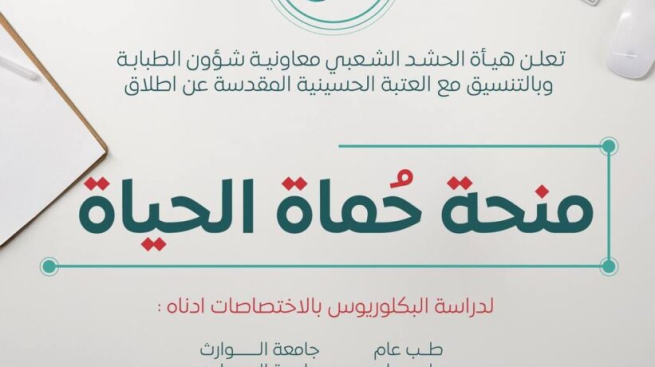 أعلنت هيئة الحشد الشعبي - معاونية شؤون الطبابة، وبالتنسيق مع العتبة الحسينية المقدسة، عن إطلاق منحة “حماة الحياة” الخاصة بدراسة البكالوريوس في التخصصات الطبية.