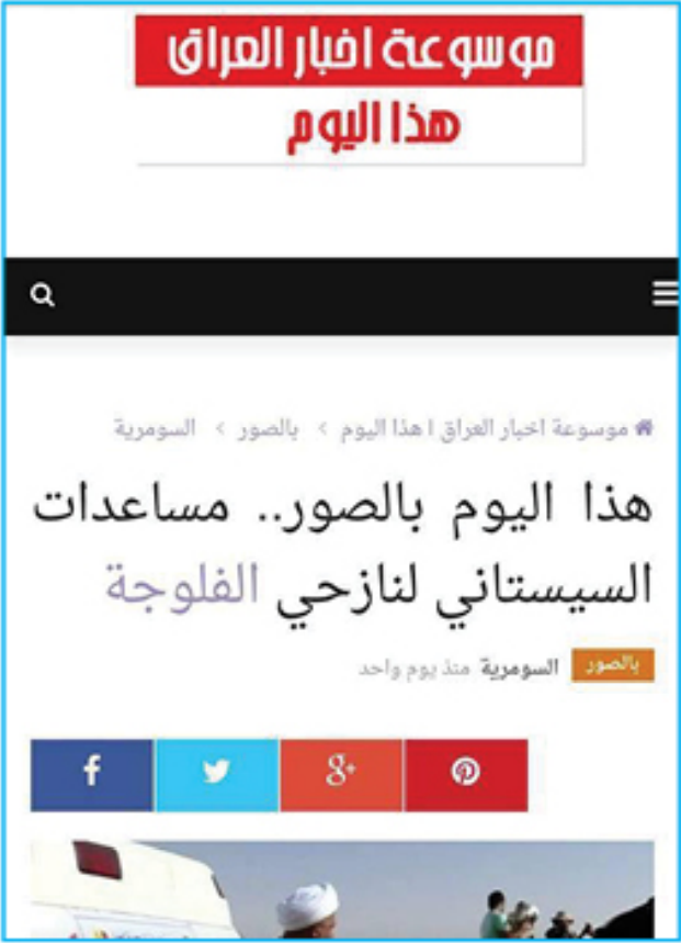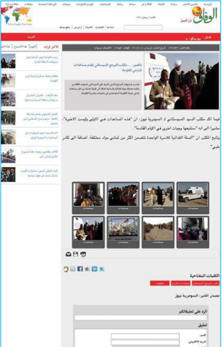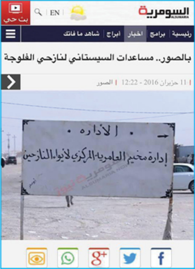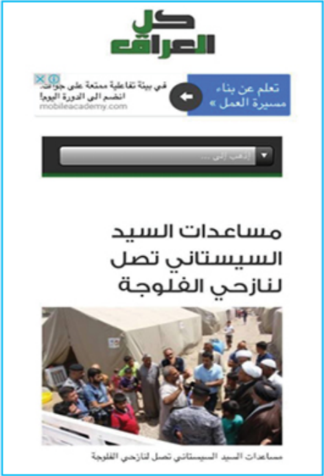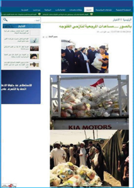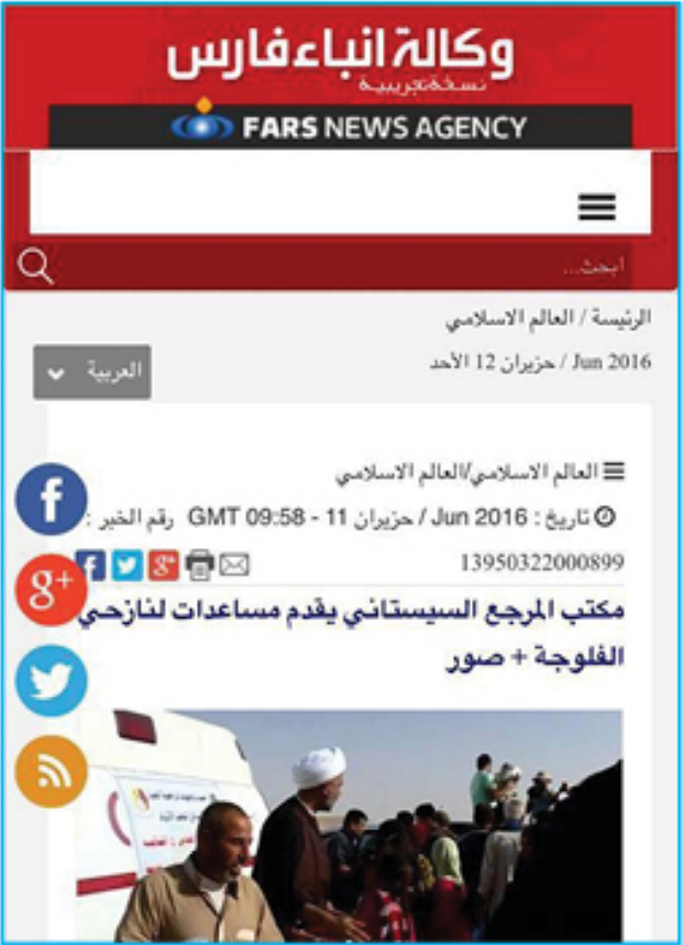 نقلت وكالات أنباء وصحف عراقية وعربية صوراً وتقارير عن قوافل المساعدات التي أرسلها مكتب المرجعية الدينية العليا في النجف الأشرف إلى العوائل النازحة من مدينة الفلوجة، ضمن حملة إنسانية واسعة لمساندة المتضررين من العمليات الإرهابية.
